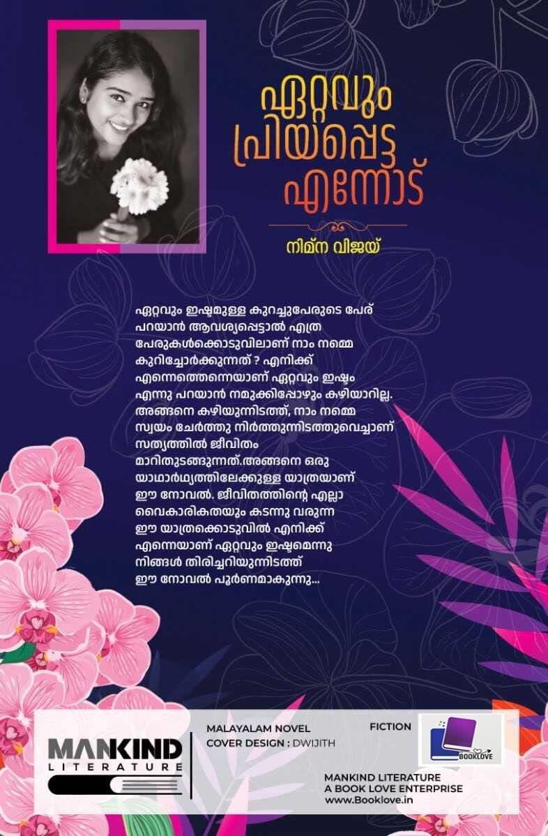 ഏറ്റവും പ്രിയപ്പെട്ട എന്നോട് ***************** Ettavum Priyappetta Ennodu : Malayalm Novel by Nimna Vijay —————– ************************* ————————– ഏറ്റവും ഇഷ്ടമുള്ള കുറച്ചുപേരുടെ പേര് പറയാൻ ആവശ്യപ്പെട്ടാൽ എത്ര പേരുകൾക്കൊടുവിലാണ് നാം നമ്മെ കുറിച്ചോർക്കുന്നത് ? എനിക്ക് എന്നെത്തെന്നെയാണ് ഏറ്റവും ഇഷ്ടം എന്നു പറയാൻ നമുക്കിപ്പോഴും കഴിയാറില്ല. അങ്ങനെ കഴിയുന്നിടത്ത് , നാം നമ്മെ സ്വയം ചേർത്തു നിർത്തുന്നിടത്തുവെച്ചാണ് സത്യത്തിൽ ജീവിതം മാറി തുടങ്ങുന്നത്.അങ്ങനെ ഒരു യാഥാർഥ്യത്തിലേക്കുള്ള യാത്രയാണ് ഈ നോവൽ. ജീവിതത്തിന്റെ എല്ലാ വൈകാരികതയും കടന്നു വരുന്ന ഈ യാത്രക്കൊടുവിൽ എനിക്ക് എന്നെയാണ് ഏറ്റവും ഇഷ്ടമെന്നു നിങ്ങൾ തിരിച്ചറിയുന്നിടത്ത് ഈ നോവൽ പൂർണമാകുന്നു.